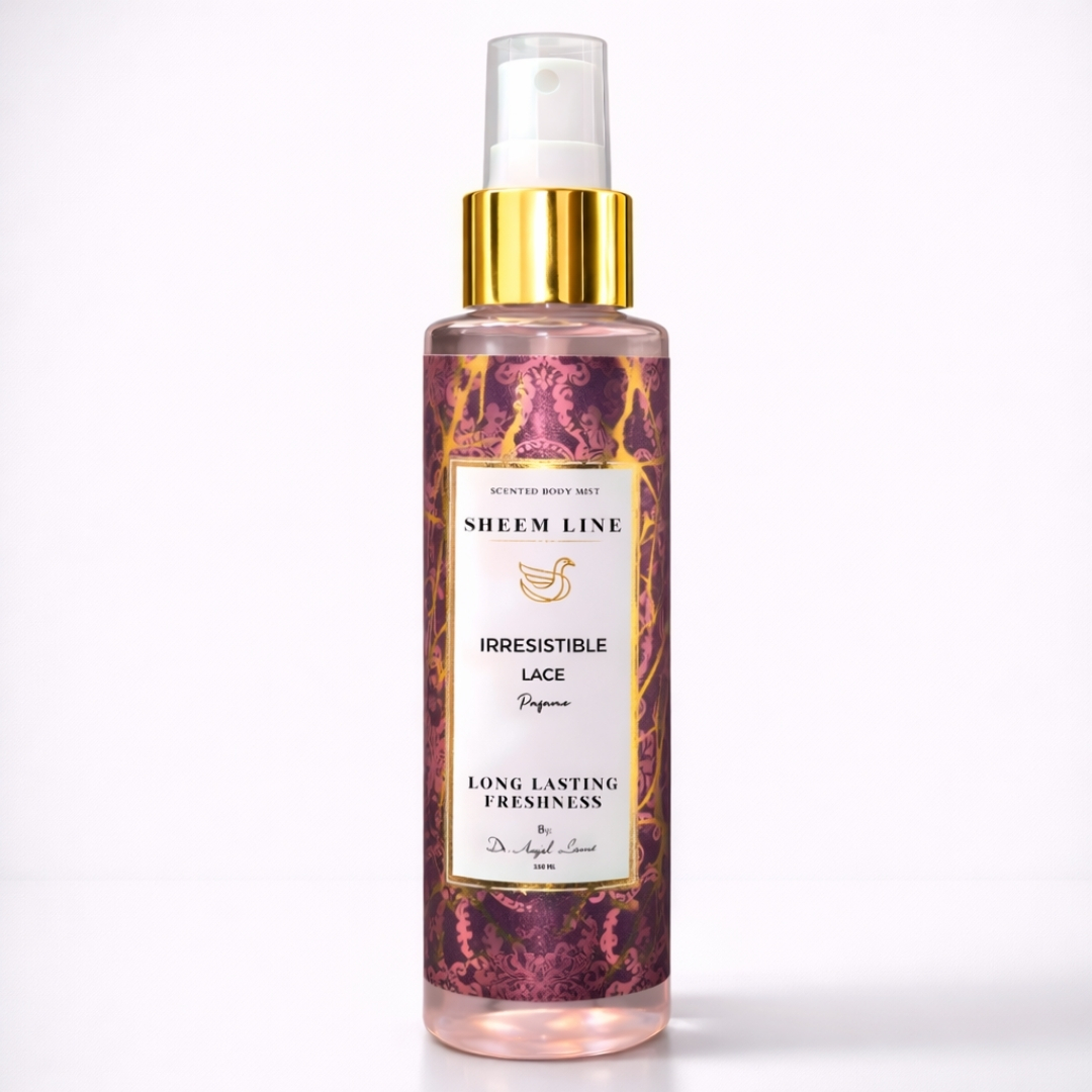 Unleash your inner charm with the seductive scent of Sheem Line. “Irresistible Lace” is a luxurious scented body mist designed for those who want to leave a lasting impression. Developed under the expert care of Dr. Ayesha Lasani, this 150ml mist offers a bold yet balanced fragrance profile that guarantees “Long Lasting Freshness” with a touch of mystery and elegance.